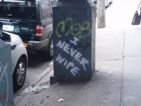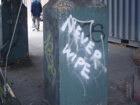 I’ve also seen strange tags and mottos. This is one I’ve seen in at least three places in Brooklyn: “I NEVER WIPE!” or simply “NEVER WIPE!”