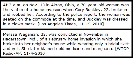 On the one hand we have a woman robbed while on the toilet by a clown, and on the other hand a woman who broke into a house half naked and high. On the whole. which victim would you rather be?