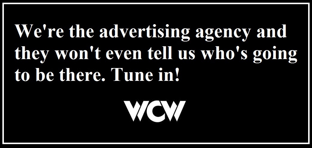 WCW was a very second-rate wrestling organization. Despite being, for a brief moment, the hottest company in wrestling (thanks to the NWO invasion angle) they had a history of mostly uninterrupted incompetence. No one in charge knew what they were doing. Scripts were written and rewritten just minutes before the show aired. And the in-ring product? Arachnaman. Heavy Metal Van Hammer. World Champion David Arquette. One year their business cards listed their location as “Altanta.” To show how clueless they were, major pay-per-view events were promoted without any idea of who was on the card. How bad were they? I have only uncovered the merest tip of the iceberg. In fact, what you see reproduced below is an actual ad ran by their pay-per-view company.
