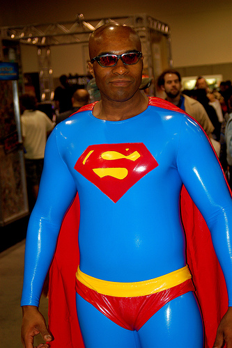 A comic book convention is a great place to go to dress up as your favorite superhero. You can do it around yourneighborhood but that might just be asking to get beat up. This guy showed up at some comic con in his homemade FAIL Superman suit. He’s all shiny and smooth, he isn’t dressed as Superman, he’s dressed as some Superman sex toy. He has to be all sweaty and his skin irritated and rashy. That thought is so gross that you may overlook the skimpy trunks and the incorrect chest emblem. Is there any surprise that he seems to be given a wide berth from all the other people there?