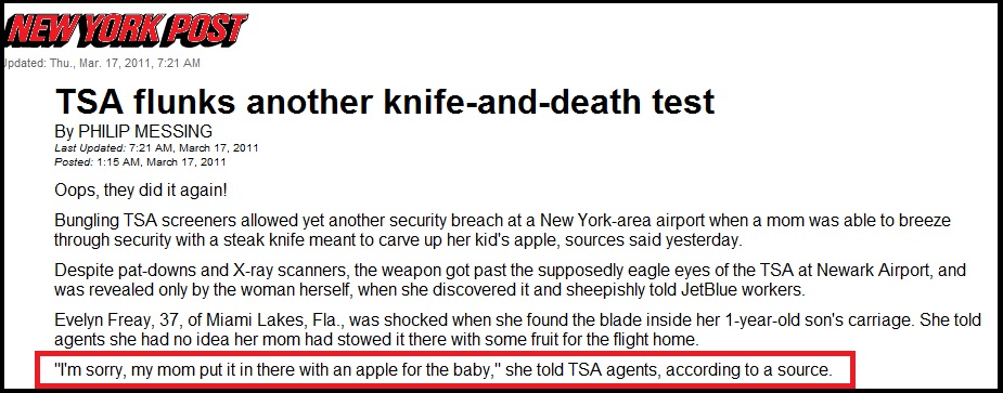 But is anyone else concerned that a woman is hiding sharp knives in her granddaughter’s baby carriage? Does this not strike anyone else as extremely stupid? I suppose the baby also plays with a barbed wire teddy bear at home. This moron has a great future in homeland security.