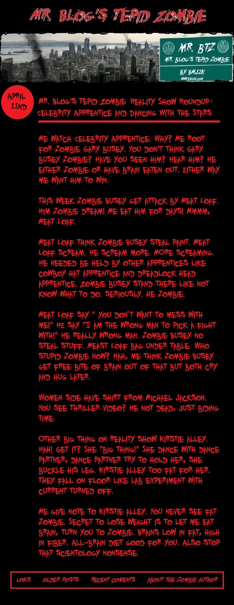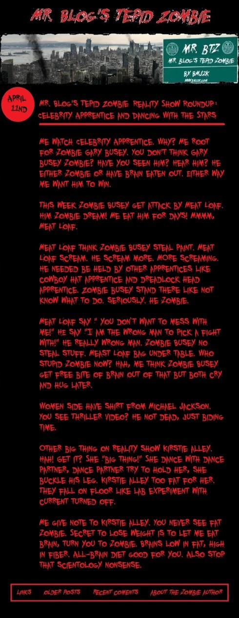 Tags: bmj2k, brains, Celebrity Apprentice, Dancing With the Stars, eat brains, Gary Busey, Kirstie Alley, Meat Loaf, Mr. Blog, Mr. Blog's Tepid Ride, Mr. Blog's Tepid Zombie, Mr. BTR, reality TV, zombie