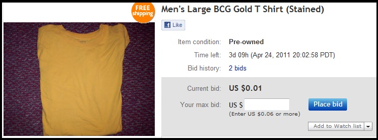 So strike one, it is a worn t-shirt, and strike two, it has a big stain. Who wants to buy this? Someone seems to since it has two bids. Someone actually bid a penny for this. This is no kind of bargain because when it arrives you are likely going to wonder “how drunk was I?” and then throw it away. And how desperate is the seller to get rid of it that he is going to sell it for a penny and lose money on the shipping? Just throw it out! It isn’t valuable, rare, or vintage. Reality check: it is a worn, stained shirt. Happy bidding!