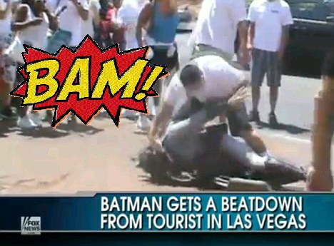 There has to be video of that. HAS to be. Middle of the Strip, tourists, guy in Batman suit getting the crap kicked out of him? This has to be on YouTube, right?