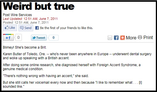 But to get back on track, reading the article brings up an imponderable question about British dentistry. The people of England are well-known for poor dentistry and bad teeth. So I submit to you this question about the British accent: is the British accent simply a matter of bad teeth? Could it simply be that the British accent is not a natural development but came about due to lousy dentists? Maybe there is no British accent, simply a neural reaction caused by head trauma.