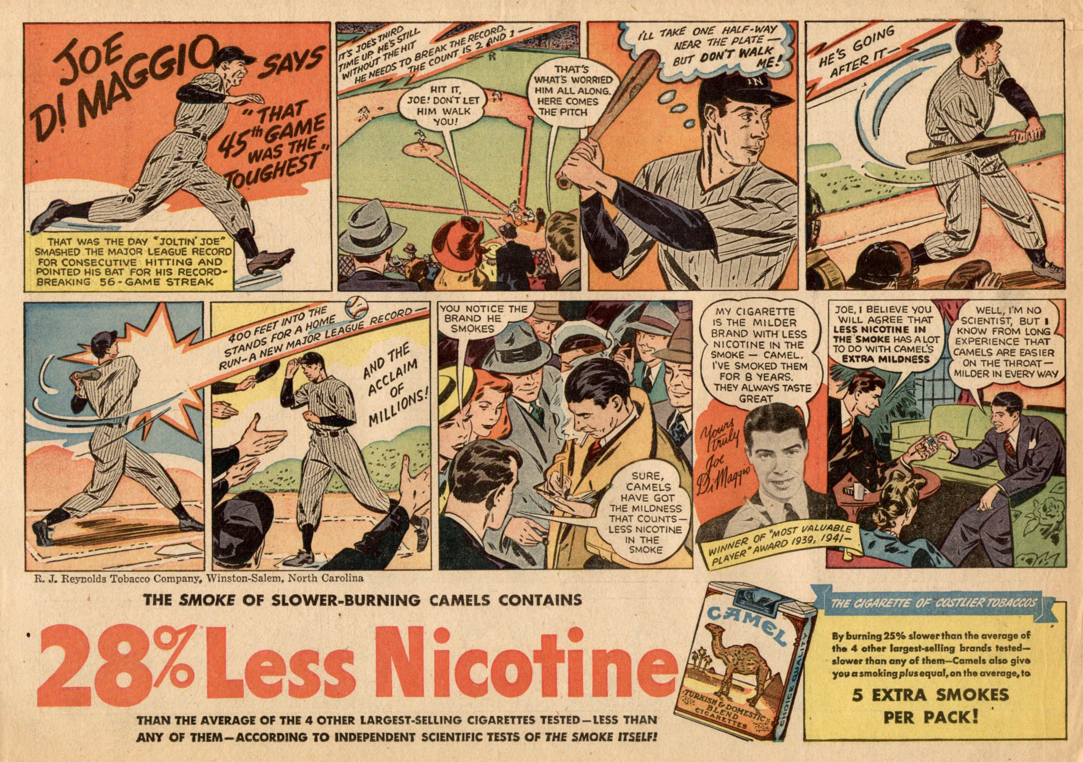 Baseball, a sports hero, and a comic strip. That pitch is aimed straight at the meaty part of the plate. I find that reprehensible, though I grudgingly admit the genius of that ad. Read it again but pay attention to what it doesn’t say, only what it implies. Nowhere does it say that smoking Camels made Joe DiMaggio a super athlete, but look at the actual photograph, with Joe talking about how he has smoked them for eight years, with his MVP award mentioned very conspicuously right below the smoking cigarette. What conclusion is a young kid reading a comic book supposed to reach? And notice the big “5 extra smokes in every pack.” You must get five more cigarettes in each pack, right? No, not really, read the fine print. And what kid does that?