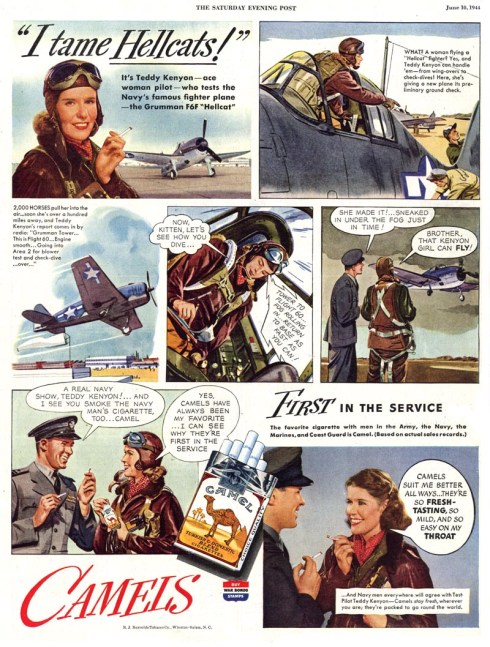 Did you catch the blatant sexism too? “WHAT? A woman flying a Hellcat fighter?” I know these have to be judged by the standards of the era, but there is a stunning lack of subtlety in these ads.