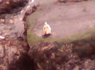 It is some sort of small figurine. You can clearly see the base. I snapped this with my cell phone so the resolution isn’t the best but it is not a rock. It is a small figure that someone deliberately placed there. I don’t know how long it has been there, but it is so small that the tide will surely wash it away. I was just standing by the water, looked down, and there it was. Keep in mind that this is not a beach. This is a seawall the end of a street behind a shopping center. There is no access unless you hop a fence and climb down and over those large rocks.
