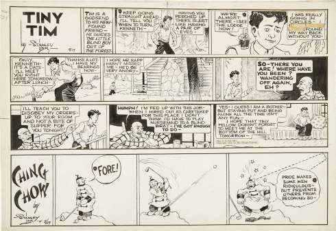 I have also included the only instance I found of a Ching Chow topper, placed at the bottom (yet still technically a “topper”) of a Tiny Tim strip. It is easy to see why Tiny Tim doesn’t run today. The Ching Chow strip below it is far better, playing off the panel borders for its gag.
