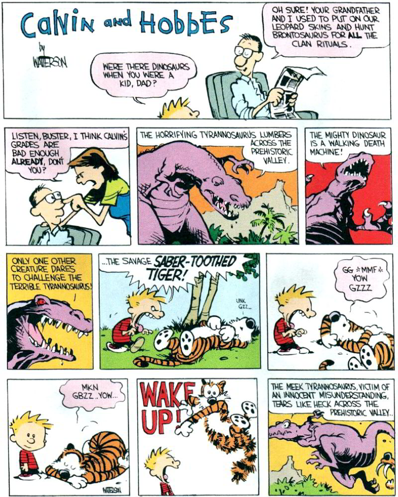 Calvin and Hobbes is one of my very favorites. While – unlike Peanuts – it was only about chldhood (usually), it is so very charming, tender, sad (in a way) to be totally unique. Schulz himself admired Watterson’s work. Among other things, he said that Watterson could draw anything equally well, while he himself couldn’t.