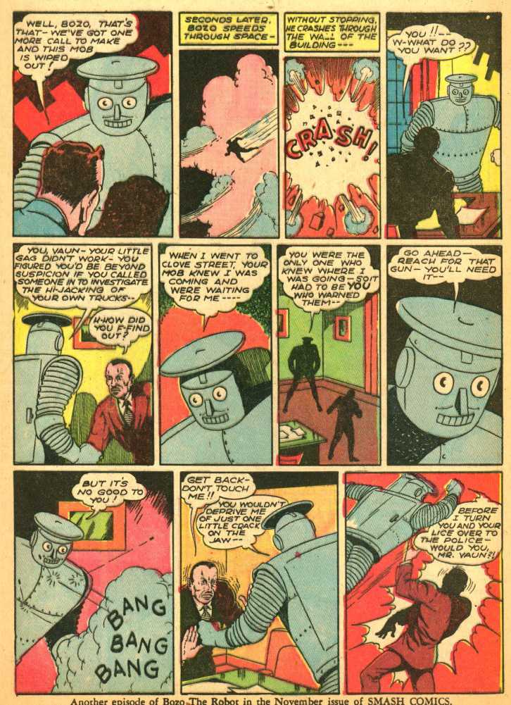 1939 was the year of the New York World’s Fair, which featured Westinghouse’s Elektro robot. This was the major event of the year in New York, and it is likely that George Brenner and most other people involved in New York based comic book industry attended the event. Elektro was well remembered by fair attendees, and could have inspired Brenner to make a robot the star of a comic book feature. Bozo even shares a design element with Electro, a round glass porthole on the chest, which exposes internal circuitry.