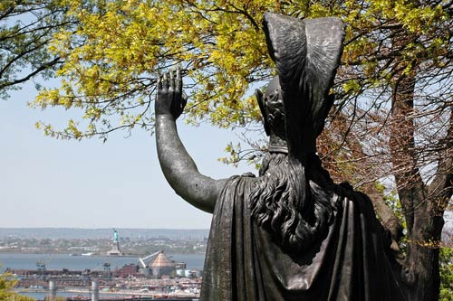 Battle Hill is found inside Greenwood Cemeteryand it was the sight of a major battle of the Civil War, part of the Battle of Long Island. You don’t hear much about it outside of history books but this was a big one. To commemorate it, a statue of the goddess Minerva was built there and from that height it has a direct line of sight to the Statue of Liberty, to whom it’s raised hand seems to be waving.