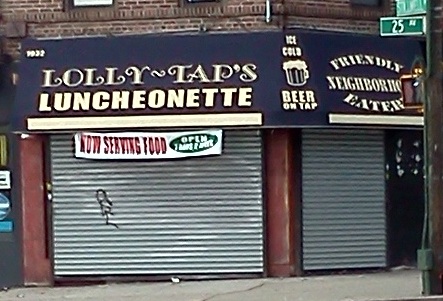 I pass fairly regularly one of the places featured in a couple of episodes of the show, a place called Lolly Tap’s. I’ve never been inside. Today I was walking by and a banner flapping in the breeze on their storefront caught my eye. I liked it so much I had to snap a picture. It was taken from across the street with my cell phone so the resolution isn’t the best but you can still see what I saw.