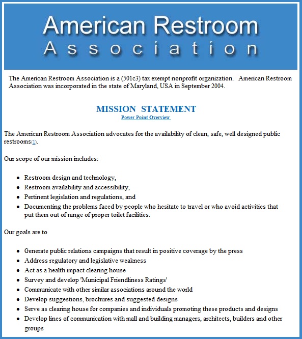 Yep, that basic Power Point cell belongs to the American Restroom Association, and if you want to see more basic and simplistic Power Point, hop on over and see for yourself. (And if you happen to be web developer, they can use you.) I checked out their site and expected to find links to bulk toilet paper warehouses or debates on the merits of hard vs. soft toilet seats but I was doomed to be disappointed. This is a very serious organization. They have a mission statement. All serious organizations have mission statements. The Boy Scouts have a mission statement. China has a mission statement. Even Vice President Joe Biden has a mission statement, but he just copied it from some Senator who used to sit next to him a few years back. Check it out the ARA mission statement: