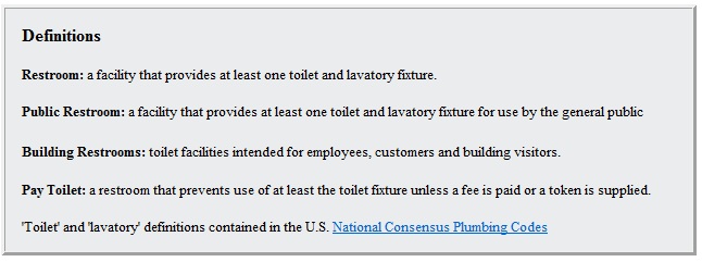 Not only do I finally know the official definition of a public restroom (I always wanted to know!) but I also know that a pay toilet requires a fee and that the US government has its collective head stuck in a toilet for coming up with a code for that. Seriously, our tax dollars, flushed away.
