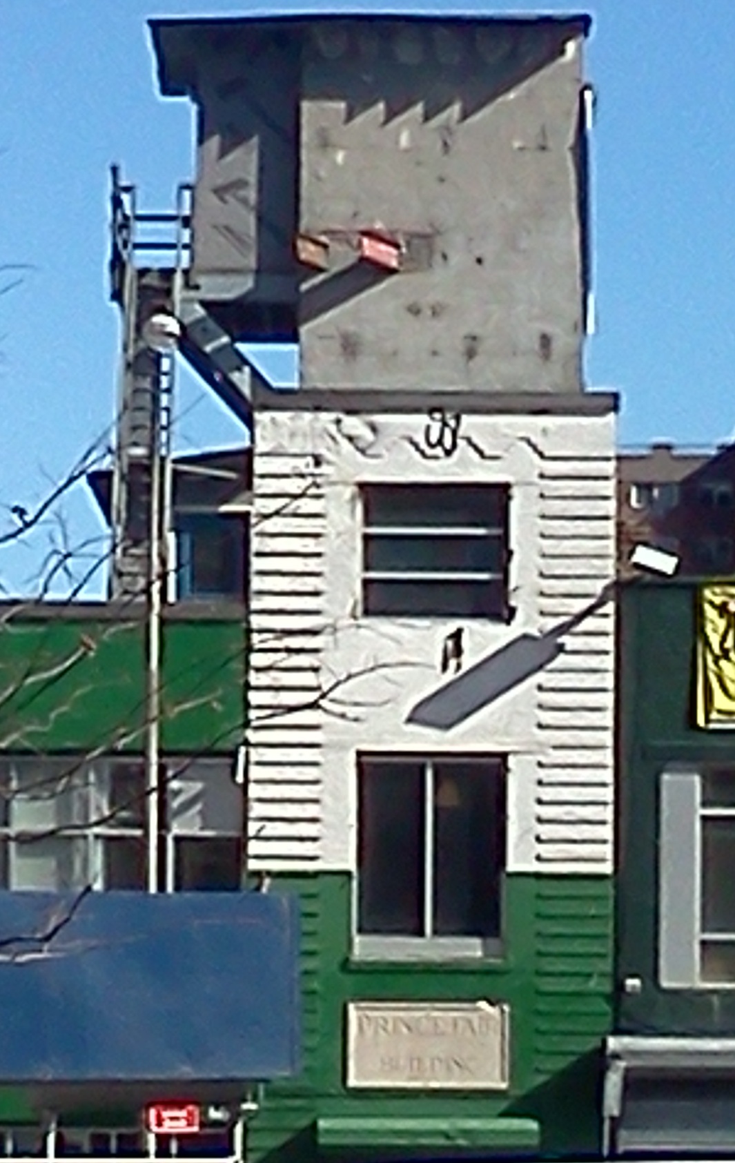 What caught my eye, as it probably did yours, is the top of the building in the center. It seems to me as if it is an orphan, the odd left-over relic of days and buildings gone by. It was apparantly connected to some other buildings, now it is just a lonely, strange, edifice.
