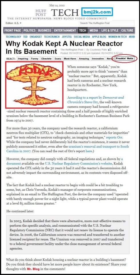 Big deal. Nikon has a wormhole to Dimension X in their basement. Proctor and Gamble is reanimating the dead in a Plan Nine-style attempt to take over the Earth. Wal-Mart already perfected their time-tunnel and traveled back in time to kill Chester A. Arthur. A nuclear reactor in Kodak’s basement? Wake me when someone doesn’t have a nuke.