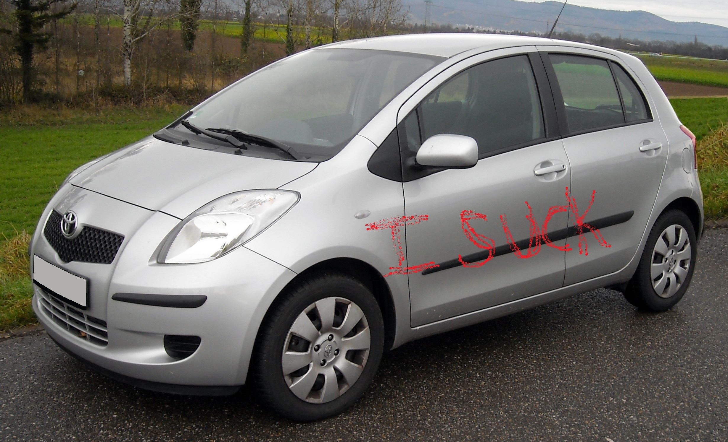 Which brings me to my car. A Yaris. A compact Yaris, in fact. What is a “Yaris”? What does it mean? I have no idea but I think the Y stands for yucky. (Give me a break; there are not a lot of insults that begin with Y. I considered Yutz but that would leave half the American South saying “huh?” and I was reeeaaaaly tempted to go with Yuranus but someone with no sense of humor would point out the obvious.) I will admit that the car drives well and it seems to be well made. But other than that it totally sucks. I only rented it because the Chrysler I wanted broke down as they drove it about 100 feet from the other end of the lot.