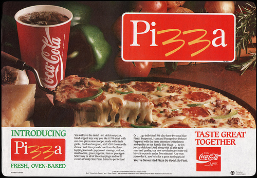 And Italy weeps. Epic……EPIC fail. Clever use of the logo aside, the pizza never looked like this. The best comparison I can think of would be if you covered a small Styrofoam Frisbee with half-melted cheese. Instead of putting the local pizzeria competition or Pizza Hut out of business, it drove customers away as they flocked to get the real thing.
