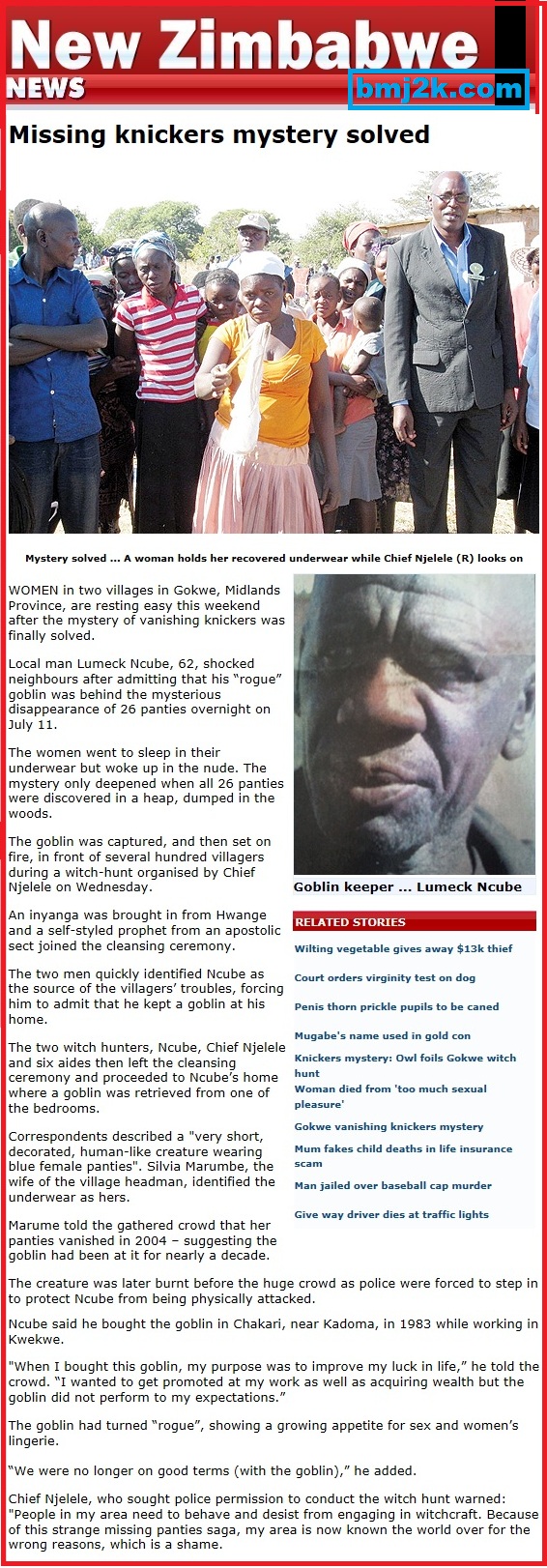 So this long, creepy saga is over. I find it only fair to let Chief Njelele have the final word. “People in my area need to behave and desist from engaging in witchcraft. Because of this strange missing panties saga, my area is now known the world over for the wrong reasons, which is a shame.”