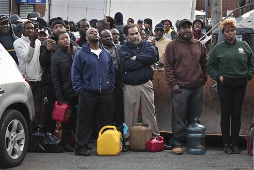 I passed no stations that were pumping gas. Most were closed and all the lights were off. But there were lines, long lines. I am not exaggerating; one closed station on Bay Parkway had a line of cars eight blocks long. There was no gas. The cars were on line and parked- engines off- in the middle of the street in the expectation that at some point there would be gas. In effect there was a line of double parked cars eight blocks long with the drivers asleep, eating, doing anything but driving. And in the gas station proper were scores, maybe almost 100 people, milling around with jugs. They looked like zombies, just standing there and swaying, not even talking to each other.