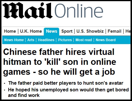 It’s not quite what you think. Basically, poor Mr. Feng’s son was a layabout no-account lazy bum who wouldn’t tear himself away from his video games long enough to get a job. So he did what any loving father would do: hired better players to constantly find his son’s presence online and kill him straightaway on the premise that if he kept getting pwn3d like a noob, he’d quit and find a job and become productive member of the ruling party. Of course, the plan didn’t work out, but it was a worthy try. I’d have just smashed the computer myself, but Dif’rent Strokes (RIP Conrad Bain) and such.