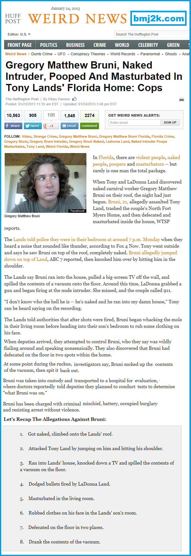• Gregory Mathew Bruni climbed onto Tony Lands’ roof (Oh yeah, he was already naked.)