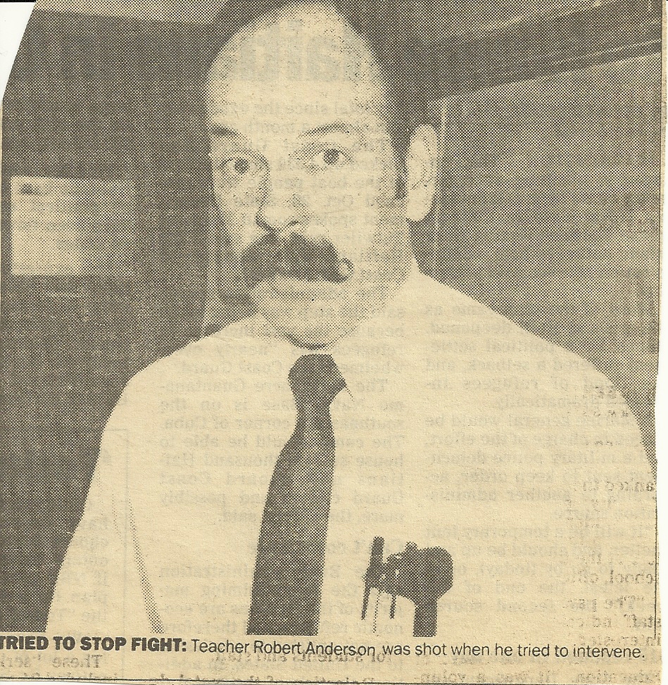 The caption reads “Tried to stop fight: Teacher Robert Anderson was shot when he tried to intervene.”