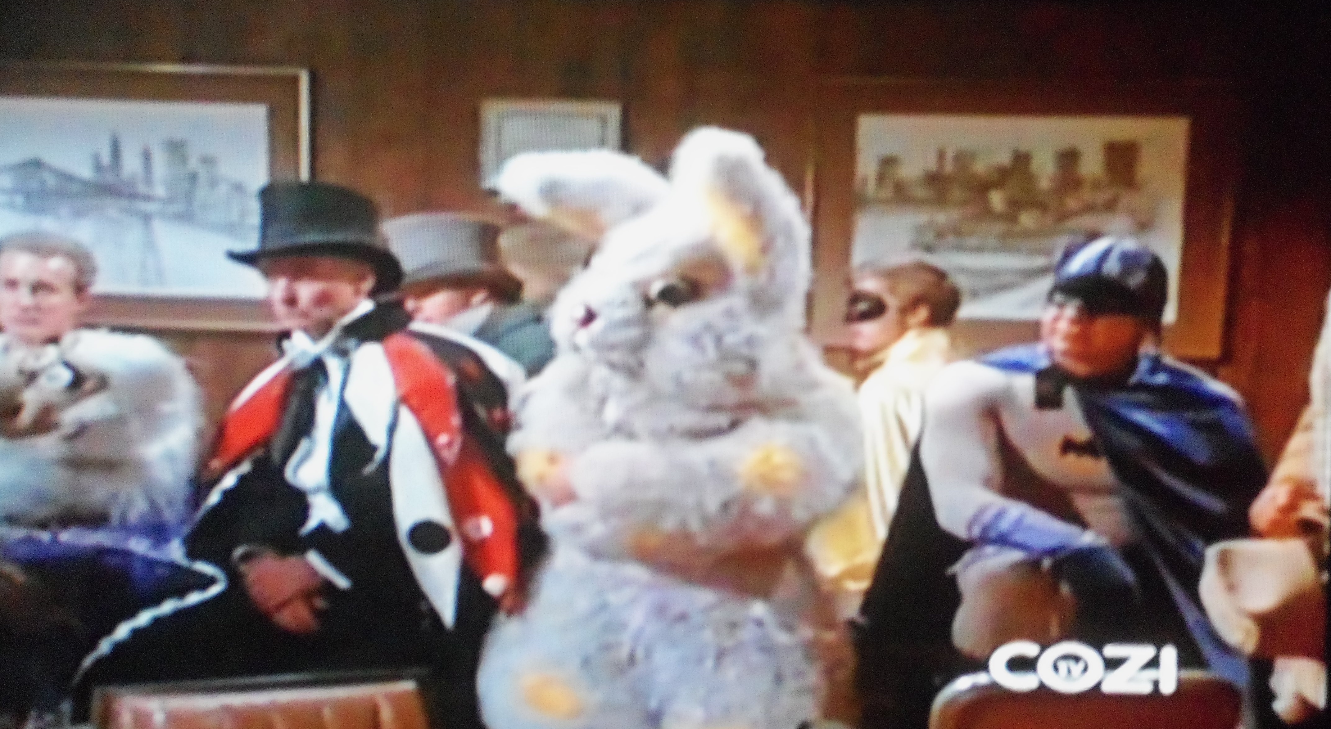 Superman was unavailable, the rights tied up with the upcoming movie, and other characters like Flash and Green Lantern were not considered mainstream enough. The McCloud version of the Super Friends consisted of, from left to right, a man dressed as either a gibbon or a mandrill, a magician, The Mad Hatter (who is a villain in the DC comics), The Easter Bunny, and Batman and Robin.