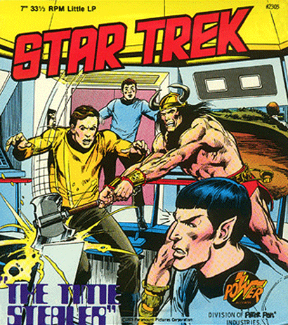 Remember Power Records? Those old 45 rpm albums that came packaged with a read along comic? They were absolutely fantastic. Star Trek, superheroes, Planet of the Apes, they were a 70’s geeks dream. While doing thing on the web, I came across a great cover of a Star Trek story, The Time Stealer. This was an original story, never aired. From Memory Alpha: