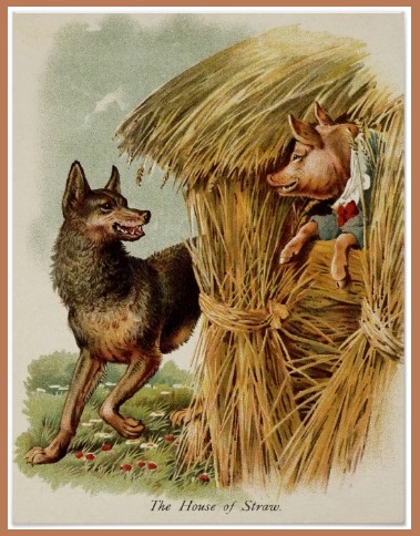 The wolf knew that no straw house would keep him out, so he huffed, and he puffed, and no, you really can’t blow a house of straw down, but he was able to more or less rip it apart with his bare hands. (Paws, claws, whatever.)