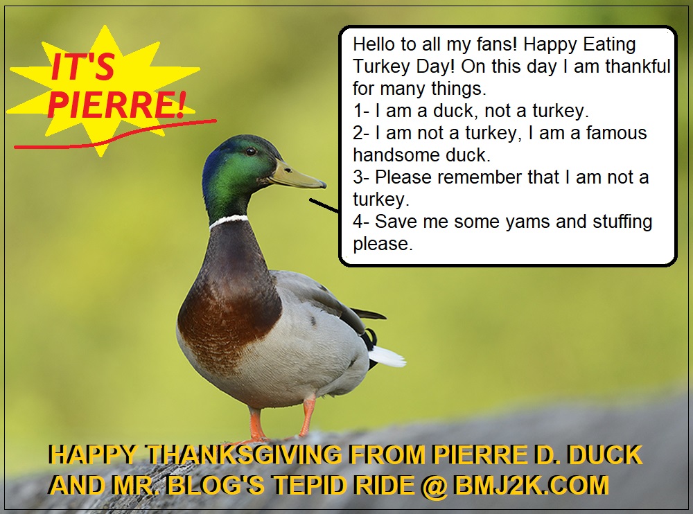 What would Thanksgiving be without a message from Pierre D. Duck, the World’s Greatest Duck? I hope we never have to find out.