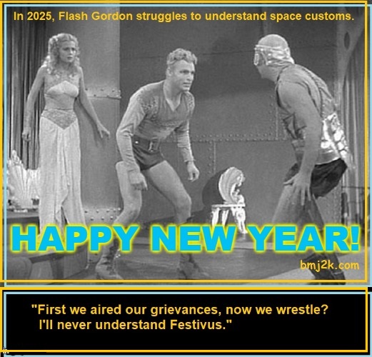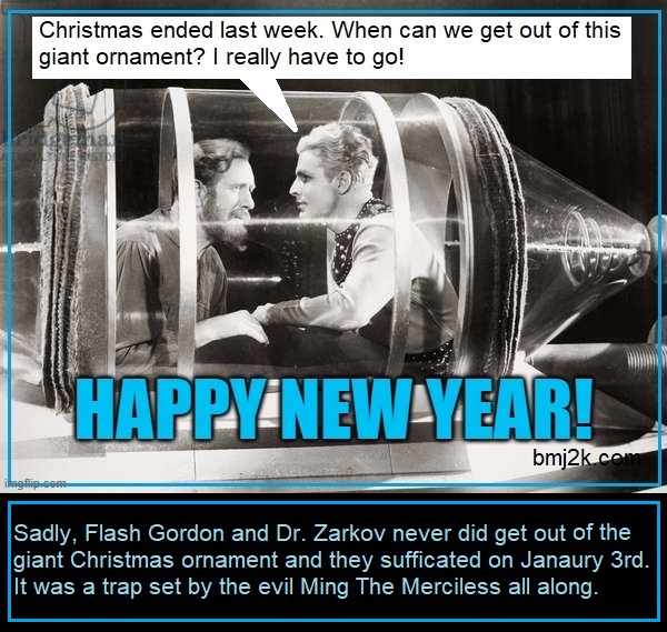 Ladies, Gentlemen, and Greblenorts from Feebex 9, The Editors and Staff of Mr. Blog’s Tepid Ride proudly (ha!) present Flash Gordon’s yearly message of holiday greetings, beamed to us from the depths of space using technology roughly equivalent to the radio in a ’57 Chevy. You may have noticed over the years that Flash is not a particularly bright fellow, and this year Flash finds himself confused by some new space customs.