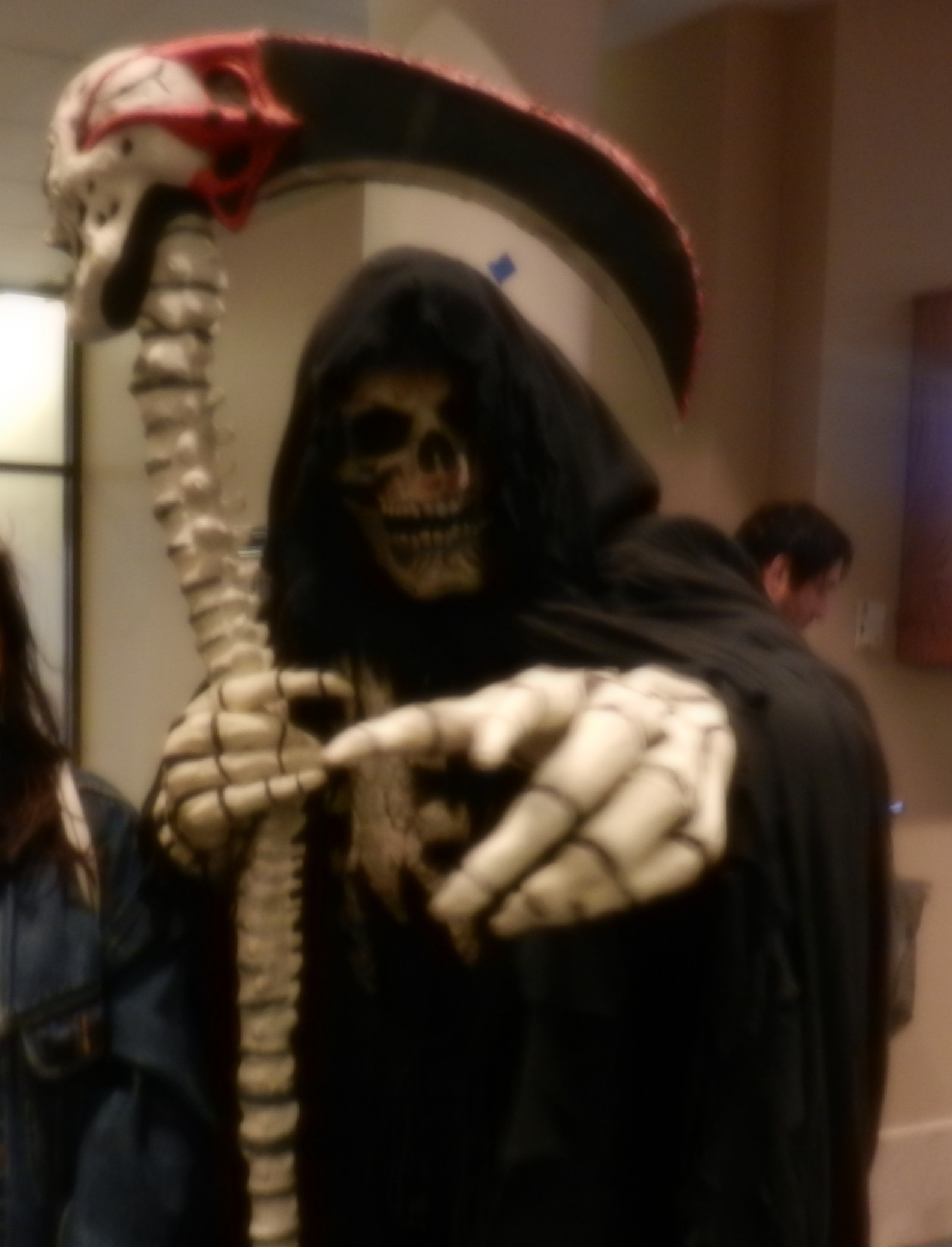 As you can tell from both pictures, Death loves hand gestures. Anyway, this particular avatar of doom would not stop yelling. You wouldn’t know it from the picture but from the depths of his rubbery skull issued the muffled voice of eternity, bellowing out “I am the REAL grim reaper! Visit my website www.therealgrimreaper.com!“ So I went to his website, and discovered that The Real Grim Reaper is a registered trademark. I hope that Pestilence, Famine, and War have protected themselves online as well.