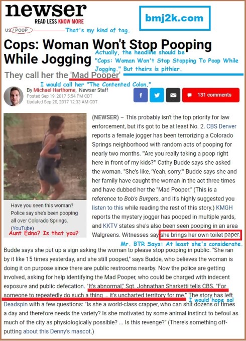 Yup, a woman in Denver has been serially pooping on people’s lawns. Like a dog would. Except that a dog’s owner would clean it up.