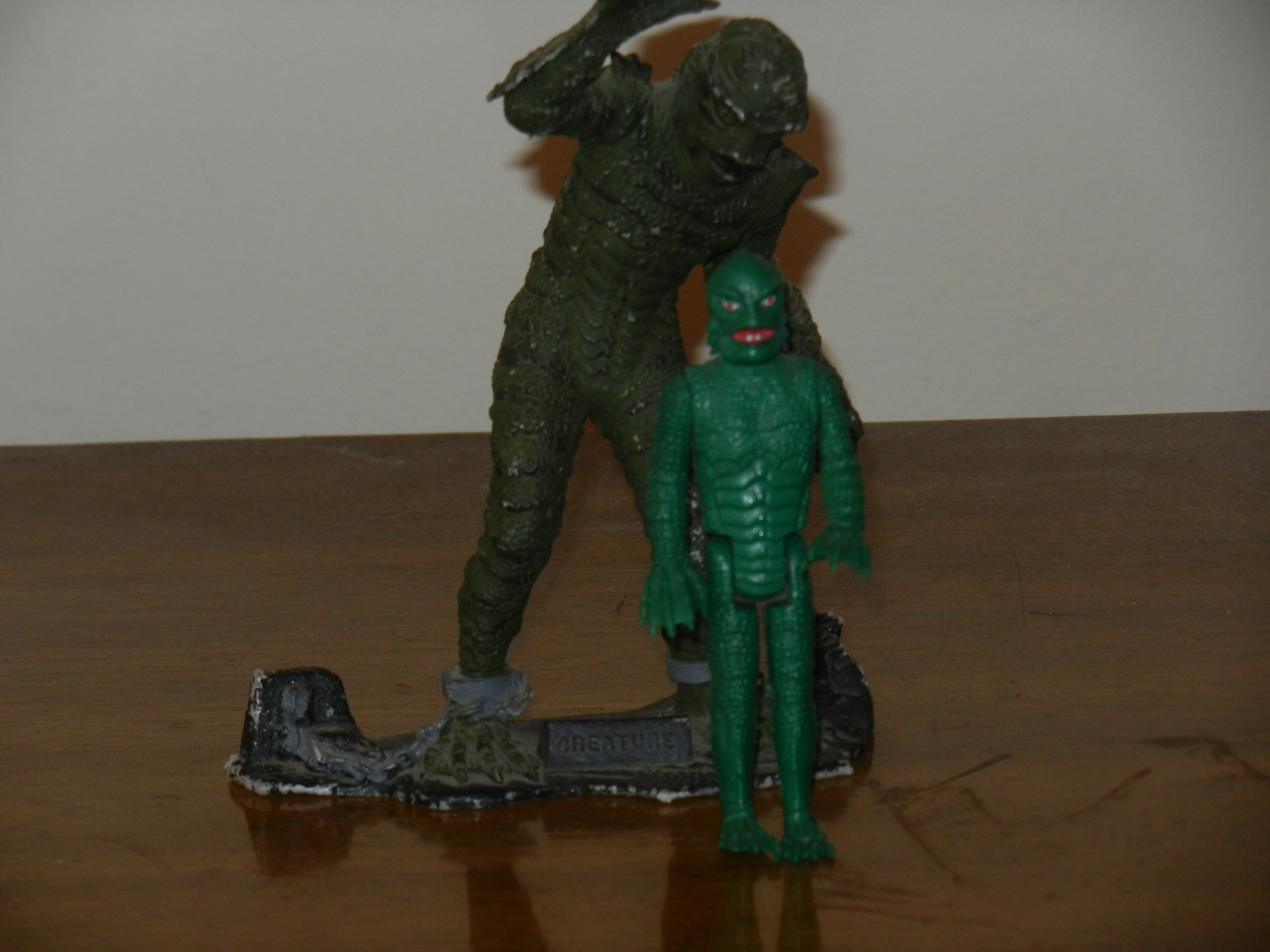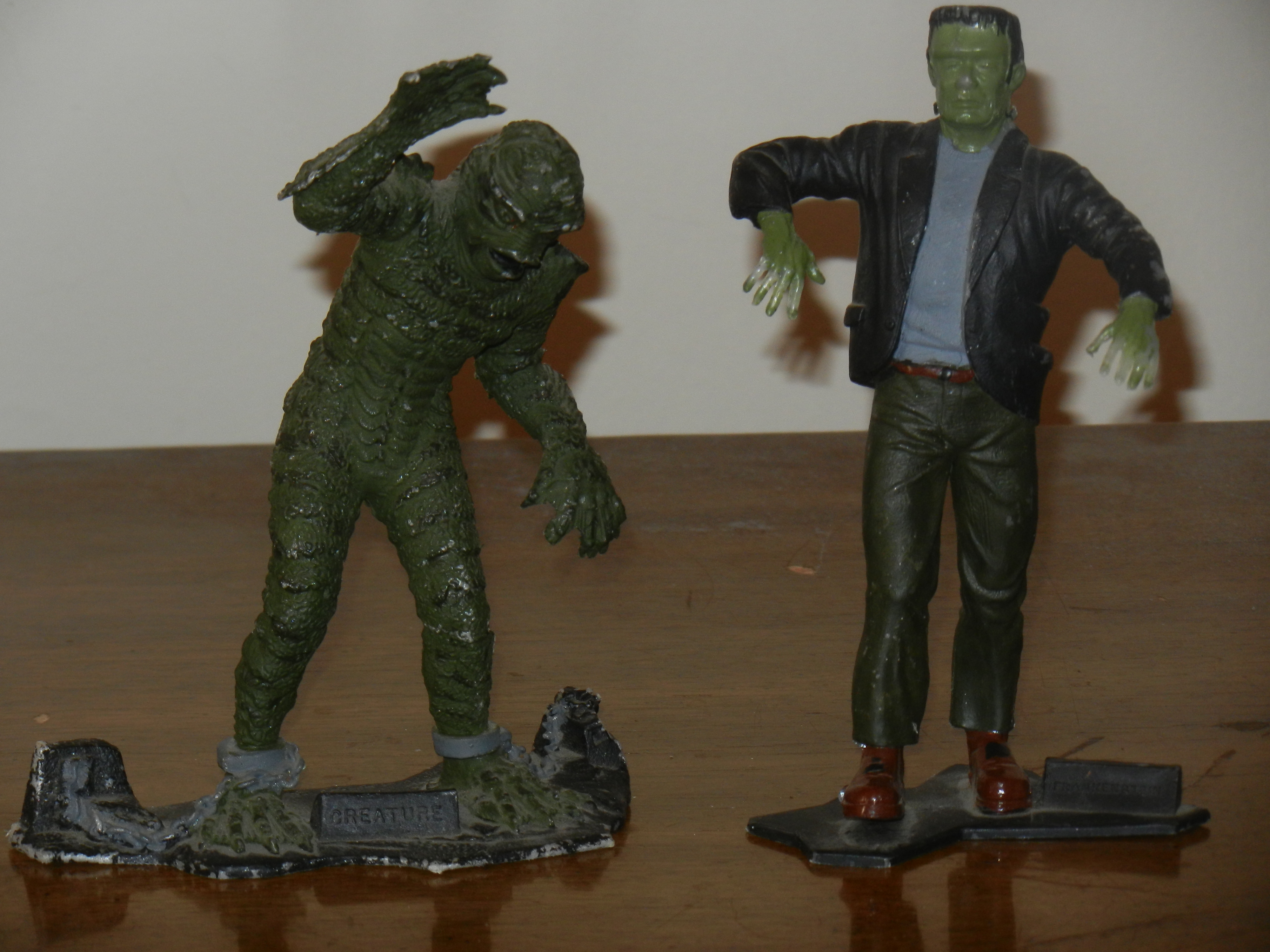 In the front is the Remco (correct me if it was another company) Creature action figure. This set had the same selection as the statues and each also came in a glow-in-the-dark version. I had all the regular figures and except for this one, they all fell apart from normal use. They literally fell into pieces. the bodies broke open, the limbs fell off, the heads fell off the neck. For some reason this figure remains sturdy. I’d love to have this set again.