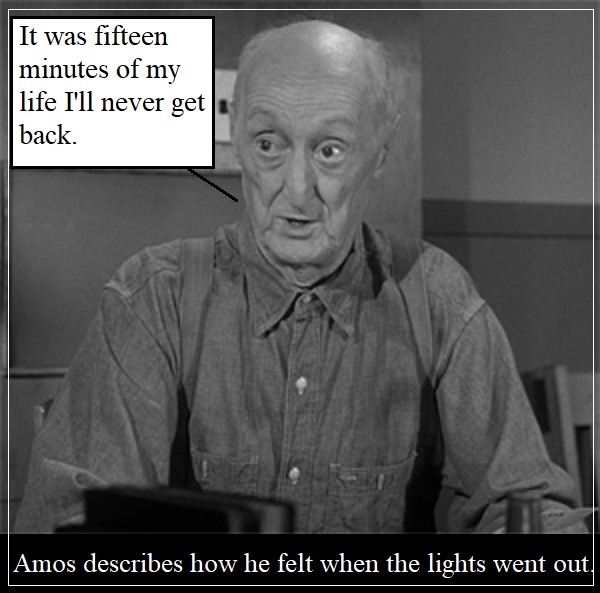 Amos explained that he was in the bathroom when the lights went out. He did not know what to do. Amos explained that after he completed his business, he slowly opened the stall door. Amos did not want to hit his head on the door, he said, so he turned with the door and closed it. But now he was turned around.
