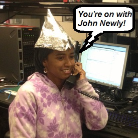 John Newly: Who are you going to call? Why you’re going to call me! Hi, I’m John Newly, your overnight airwaves-buster, and this is Lying Awake with John Newly. Later tonight we’ll be talking with Peter von Strauss about his new book, called President Obama is Just What You Think. I’ve read some of part of one of the chapters of that book and let me tell you, it gave me something to think about. Also tonight we’ll have our regular Wednesday guest, Laura Millings, and she’ll share her investigation into the strange odor reported coming from a pants factory in Detroit. We’re going to start off with some phone calls after these words from our sponsors.