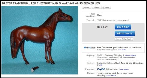 This isn’t the first horse with a broken leg I’ve found on eBay. Even better, if you go back to my old posts, you’ll find a unicorn with a broken horn, which in my book makes it a plain old horse. This particular ol’ Man ‘o War is selling for the less than princely sum of $4.99. Toss in the shipping and this can be yours for less than $15. Or, if you are like me, it will not ever be yours. Who would want this? Ok, so it comes with the leg and you can glue it back on. Is it worth it for a small horse statue? You have to buy a broken horse and glue it together to decorate your home? Have some respect for yourself, skip this auction.