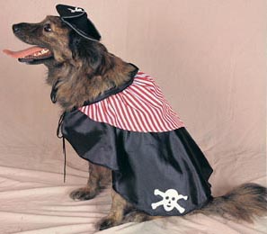 Here we have a doggy pirate. How do we know he’s a pirate? I am not sure. I may have seen the same outfit listed as “leather fetish dog” and “bone smuggler.” And what is up with that dog’s tongue? Worse, who thought it would make a good picture? Gene Simmons?