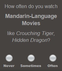 Now here was a dilemma. The question is perfectly proper. But how to answer it? I have seen Crouching Tiger twice. I used to watch those old kung-fu flicks channel 5 used to show on Sunday afternoons but those were dubbed. (And pretty badly too.) I knew that if I hit “sometimes” I’d get nothing but films I couldn’t understand and probably wouldn’t watch even if I did, so I hit “never” again.