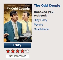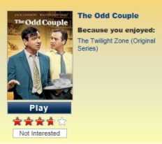 Really? The Odd Couple? Because I enjoyed The Twilight Zone? Is it enough for Netflix that Walter Matthau was in an episode of The Twilight Zone? Honestly, I don’t watch that show just for him. And it is a good thing because I am pretty sure he wasn’t ever in one. And neither was Jack Lemon. I’m just going to have to throw my hands in the air and give up on that one. (For the record, I happen to love The Odd Couple but it has zero to do with The Twilight Zone.)