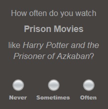How do I answer that? On the one hand I never saw a Harry Potter film in my life but on the other hand I love Escape from Alcatraz with Clint Eastwood and Patrick McGoohan. I guess “never” would be the best answer since I don’t think there are very many prison movies like Harry Potter and the Prisoner of Azkaban. All I can think of is what if HBO’s OZ was produced for the Disney Channel? Someone needs to program some better algorithms into Netflix’s software.