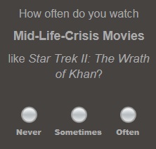 Again, WTF? Wrath of Khan is easily the best Trek film (and no arguing with me in the comments section!) and a personal Top Ten Must Watch. If it is on TV, I watch it. (Goodfellas is on that list too, with Jaws.) And yes, Kirk’s mid-life crisis is a theme of the film, but to call Star Trek II a mid-life crisis movie is like calling Halloween a film about a babysitter. Well yes, but…