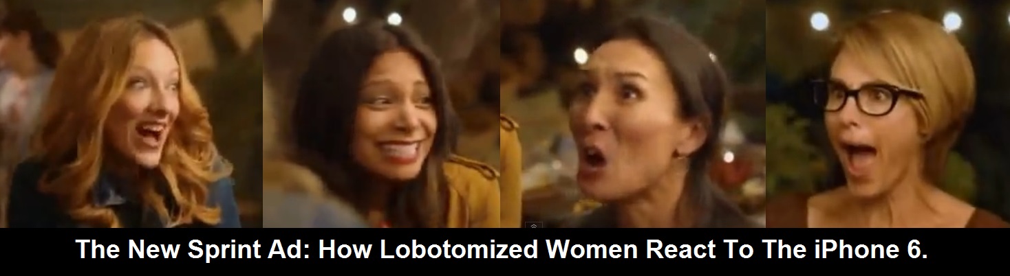Specifically, I apologize for this insipid, ridiculous Sprint ad, which could only have been created by a male advertising executive. (Advertising executives are pretty much on the bottom of the ladder of tastefulness, only rivaled by used car salesmen and members of Congress.)