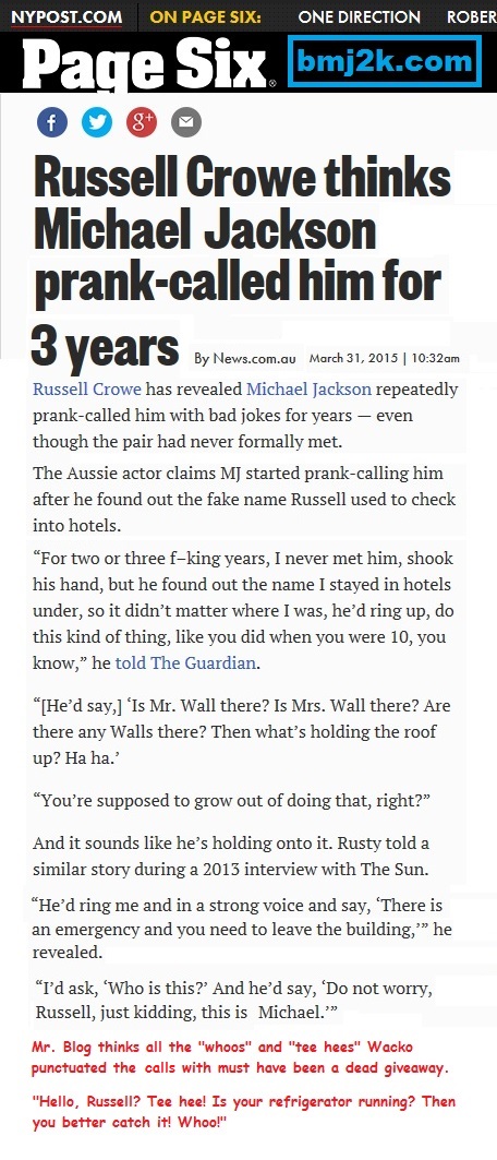 According to Crowe, he was the victim of prank calls for years, all perpetrated by Michael Jackson. I’ll let the New York Post (our motto: “Sure, whatever, we’ll print it.”) take it from here: