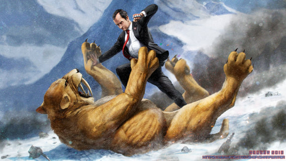 I’ll show just two of these epic awe-inspiring pieces. First, Nixon vs a Sabertooth Tiger: