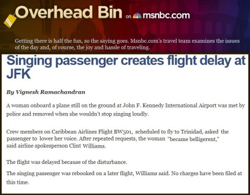 Why wouldn’t she shut up? Who did she think she was, Jennifer Hudson? (Whom I totally can’t stand. Ever listen to her talk? She sounds borderline illiterate. Listen to her Weight Watchers commercial where she pronounces it “Watchuzz.”) Seriously, did the other passengers need her singing? I’m surprised no one took matters into their own hands and delivered some sky justice to her. It is bad enough you can’t get a bag of peanuts, you have to listen to that nut?