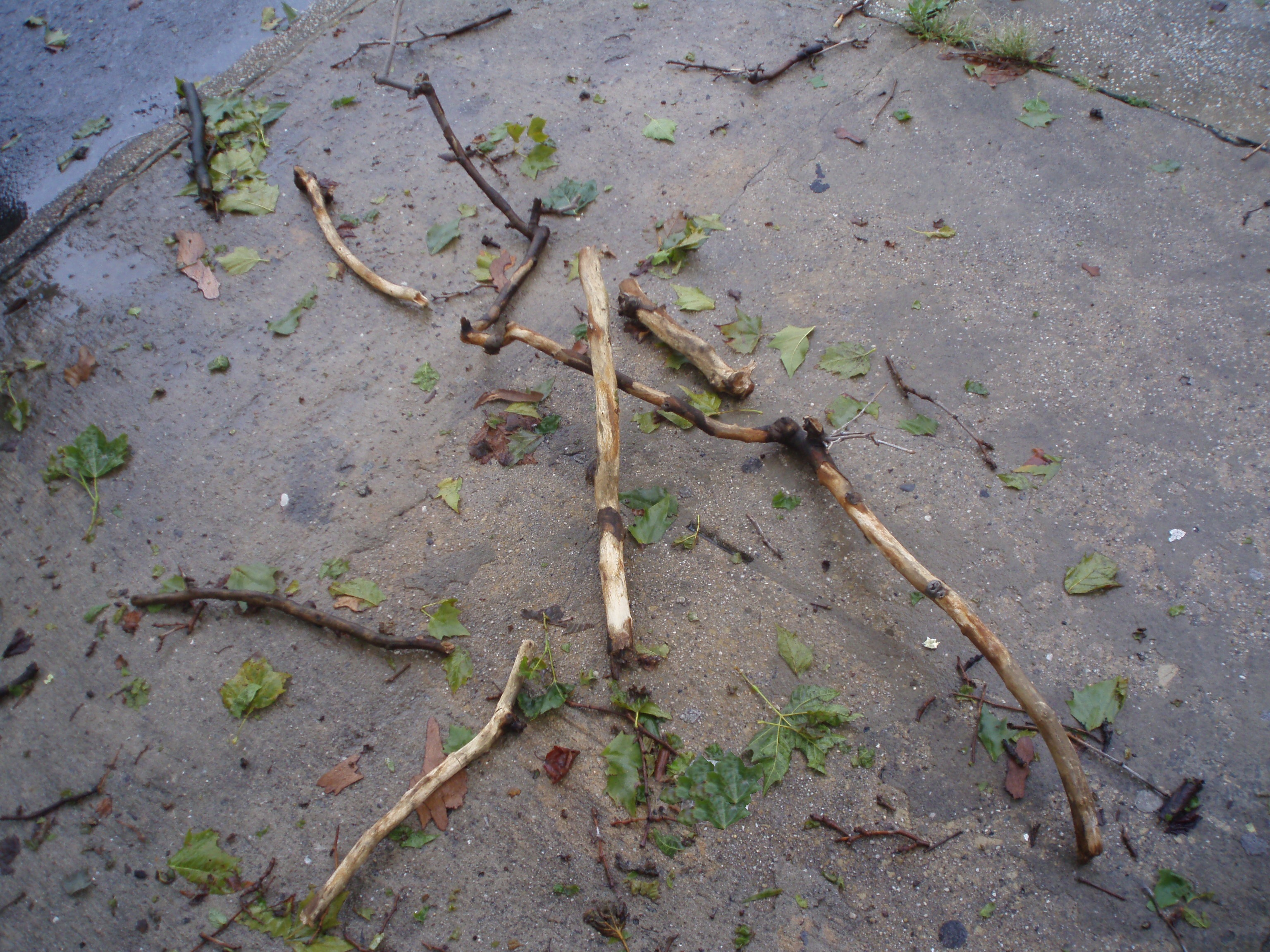 Hurricane Irene hit NYC this week and while there was major flooding and about a million people lost power, somehow the worst that my immediate area got was broken branches on the ground. The ones above landed in an “X” and to me, it reminds me of some sort of anicent talisman.