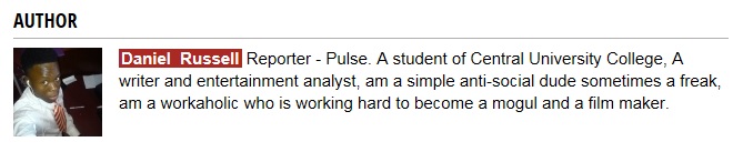 Daniel Russell. Reporter – Pulse. A student of Central University College. A writer and entertainment analyst, am a simple anti-social dude sometimes a freak, am a workaholic who is working hard to become a mogul and a film maker.